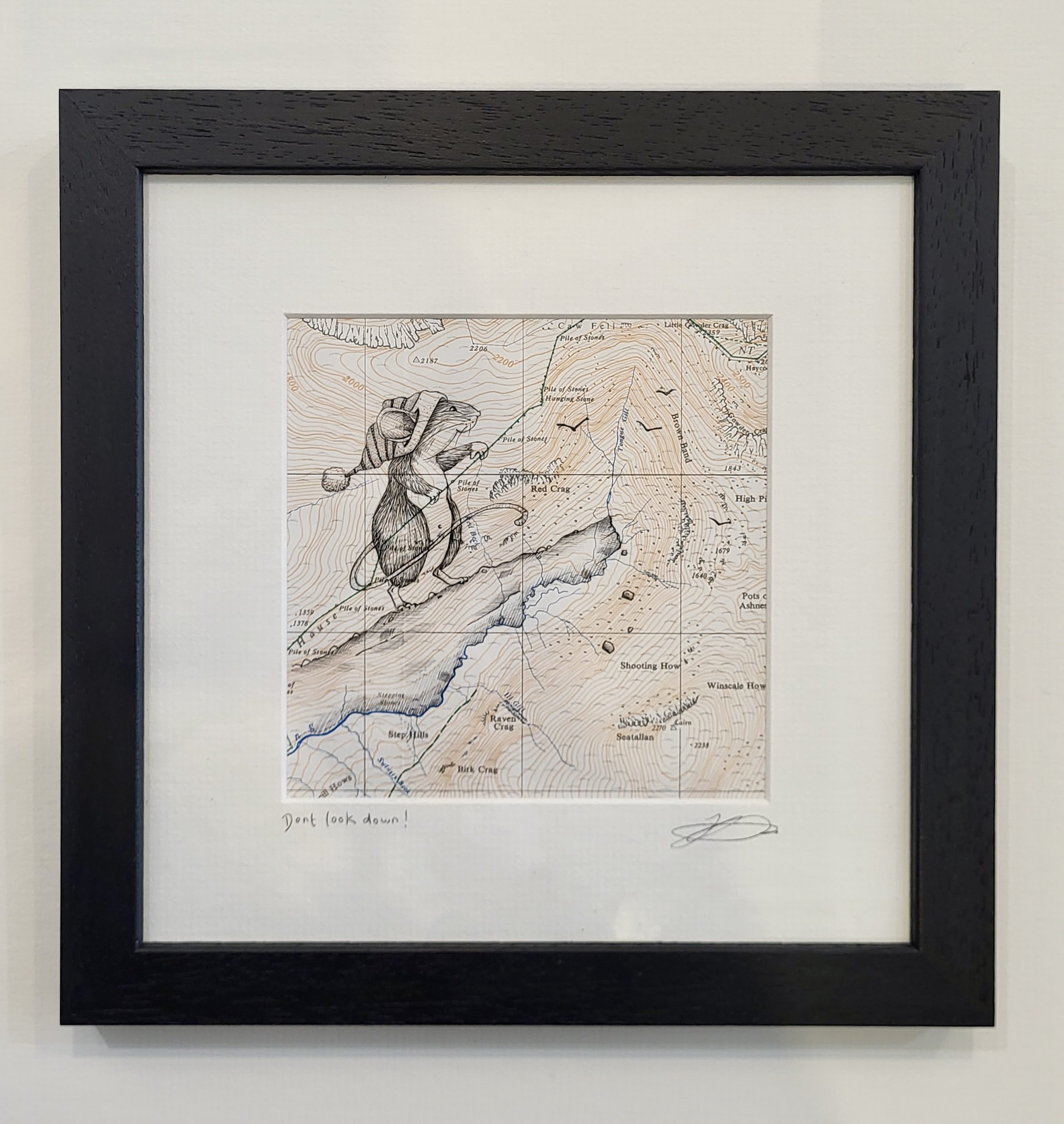 Don’t Look Down – Original Drawing on Vintage Map of Hiking Mouse