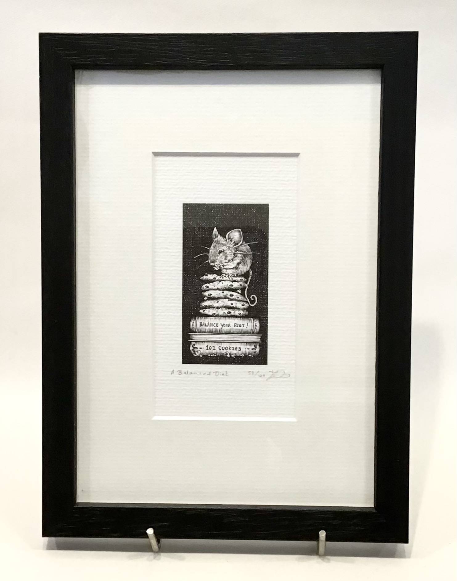 A framed, limited edition print of a beautifully whimsical drawing of a mouse sitting on a stack of biscuits. The artwork is framed and mounted in a black solid wood frame, which has been hand-cut and joined. Comes with a signed certificate of authenticity on the reverse. Ready to hang on a wall. Exterior dimensions of the frame: approximately 17cm x 23cm, frame thickness approximately 1.5cm.