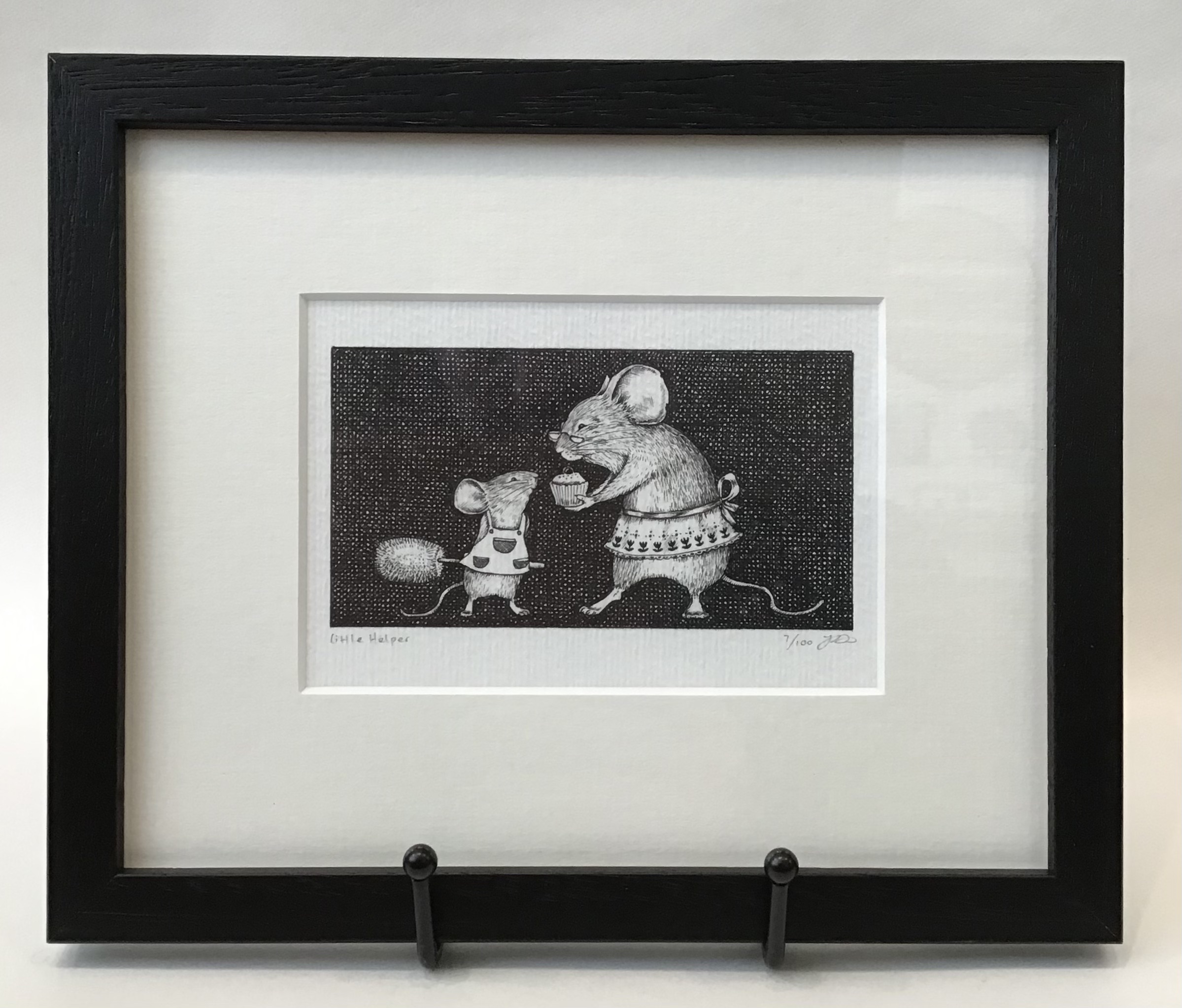 A framed, limited edition print of a small mouse helping its mother with household chores. The artwork is framed and mounted in a black solid wood frame, which has been hand-cut and joined. Comes with a signed certificate of authenticity on the reverse. Ready to hang on a wall. Exterior dimensions of the frame: approximately 18.5cm x 22.5cm, frame thickness approximately 1.5cm.