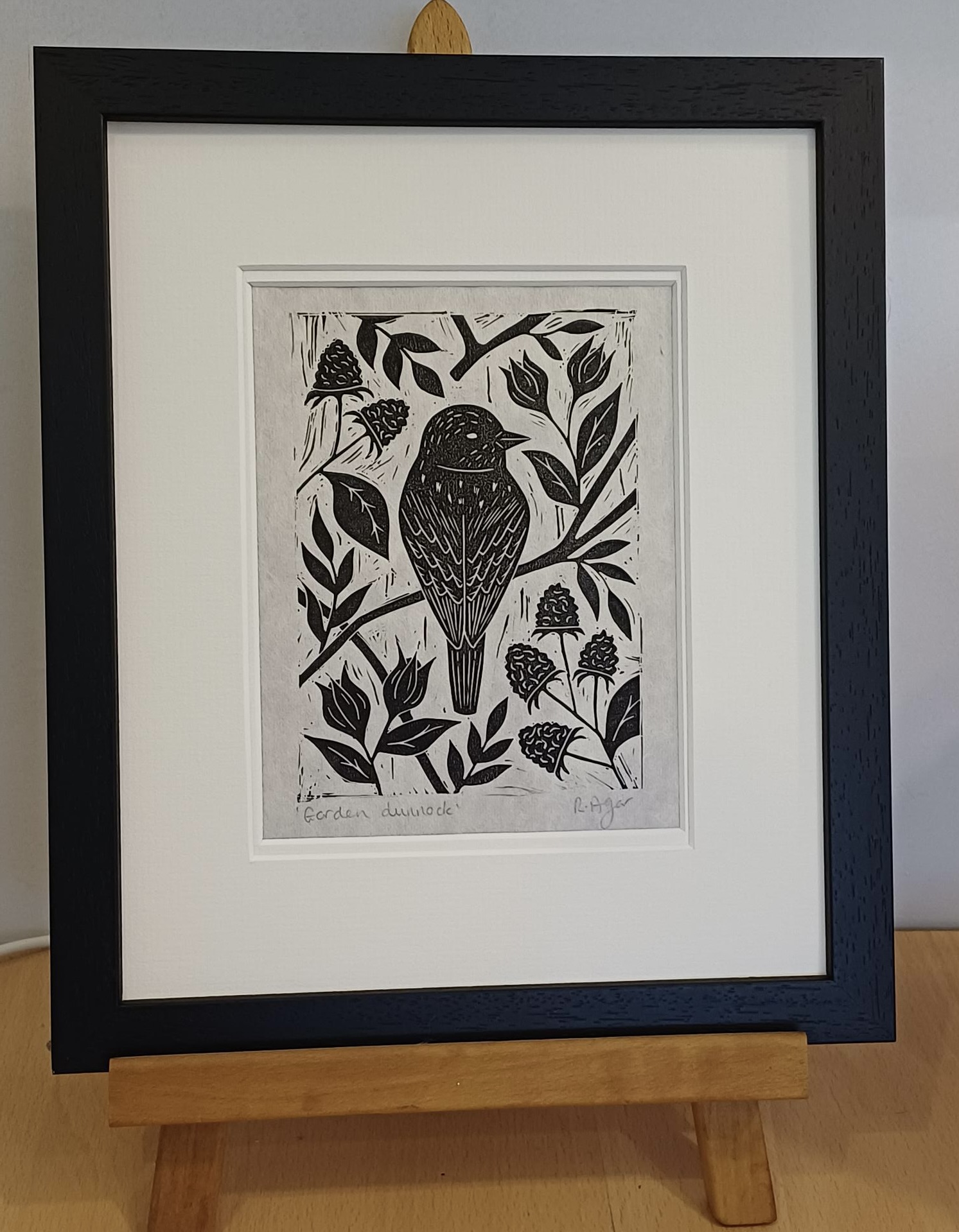 Hand-printed lino cut print of a garden dunnock. The artwork is framed and mounted in a handcrafted, painted black solid wood frame. Ready to hang on a wall. Exterior dimensions of the frame: approximately 26cm x 30.5cm, frame thickness approximately 2cm.
