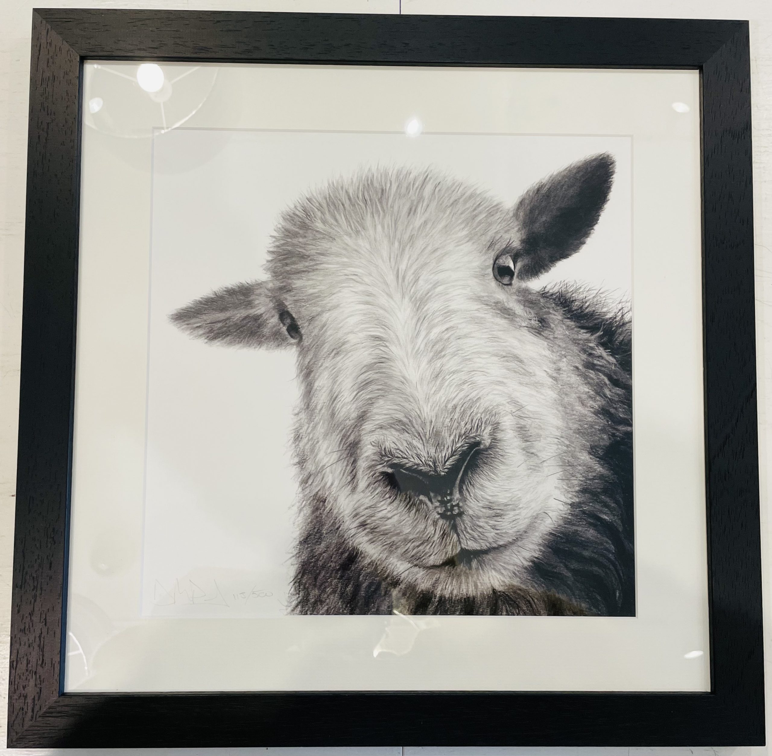 Framed, signed, limited edition ‘Bonnie’ print, by David Pooley, in a black solid wood frame, hand cut and joined. Ready to hang on a wall. Exterior dimensions of the frame: approximately 17.5 inches square, frame thickness approximately 3cm, mount widths approximately. 4 – 4.5cm. A larger print is also available in a 22-inch square frame, with a 3cm frame thickness and a 5-6cm mount width. Each one is given a print number, so it may be different from the number shown on the back here.