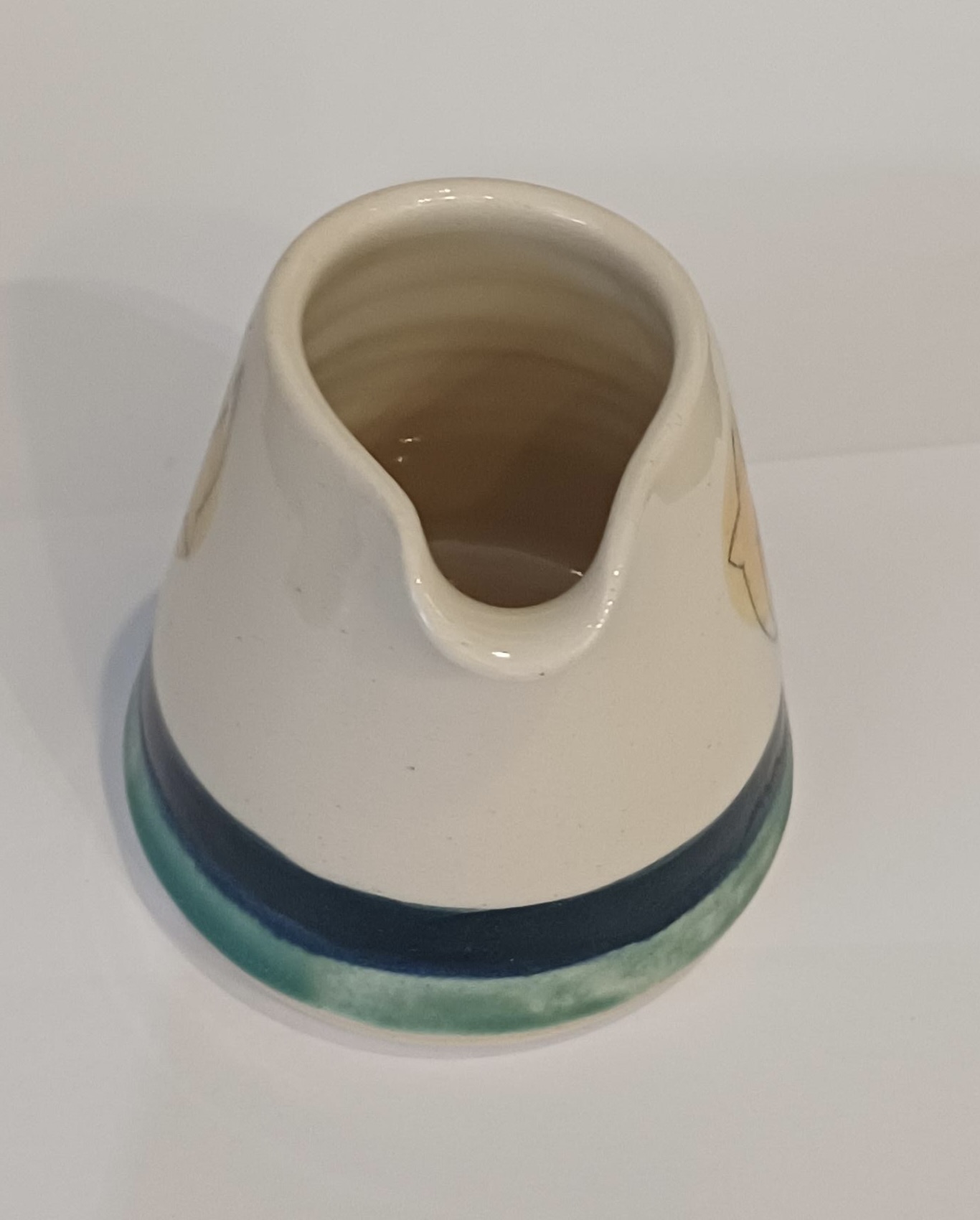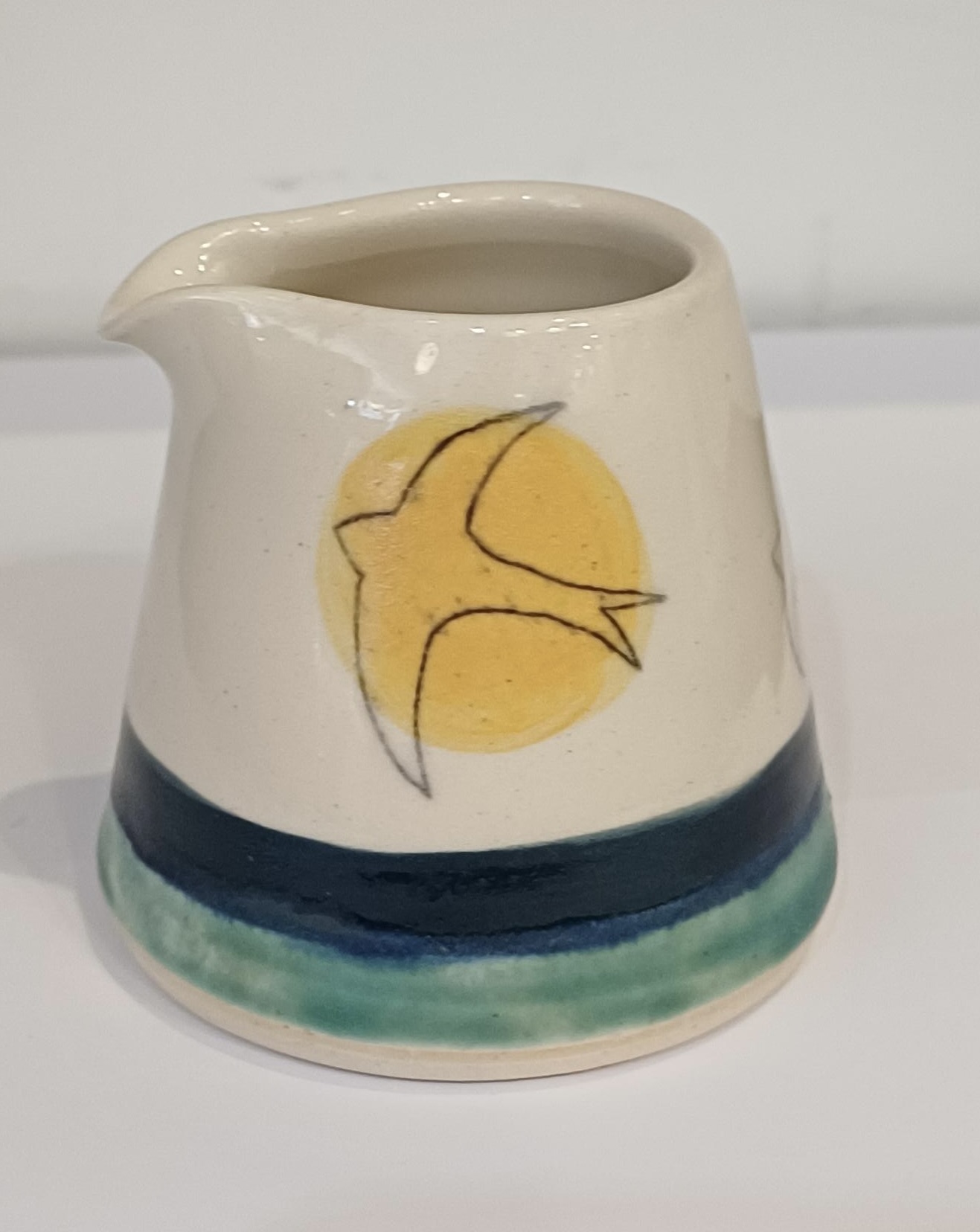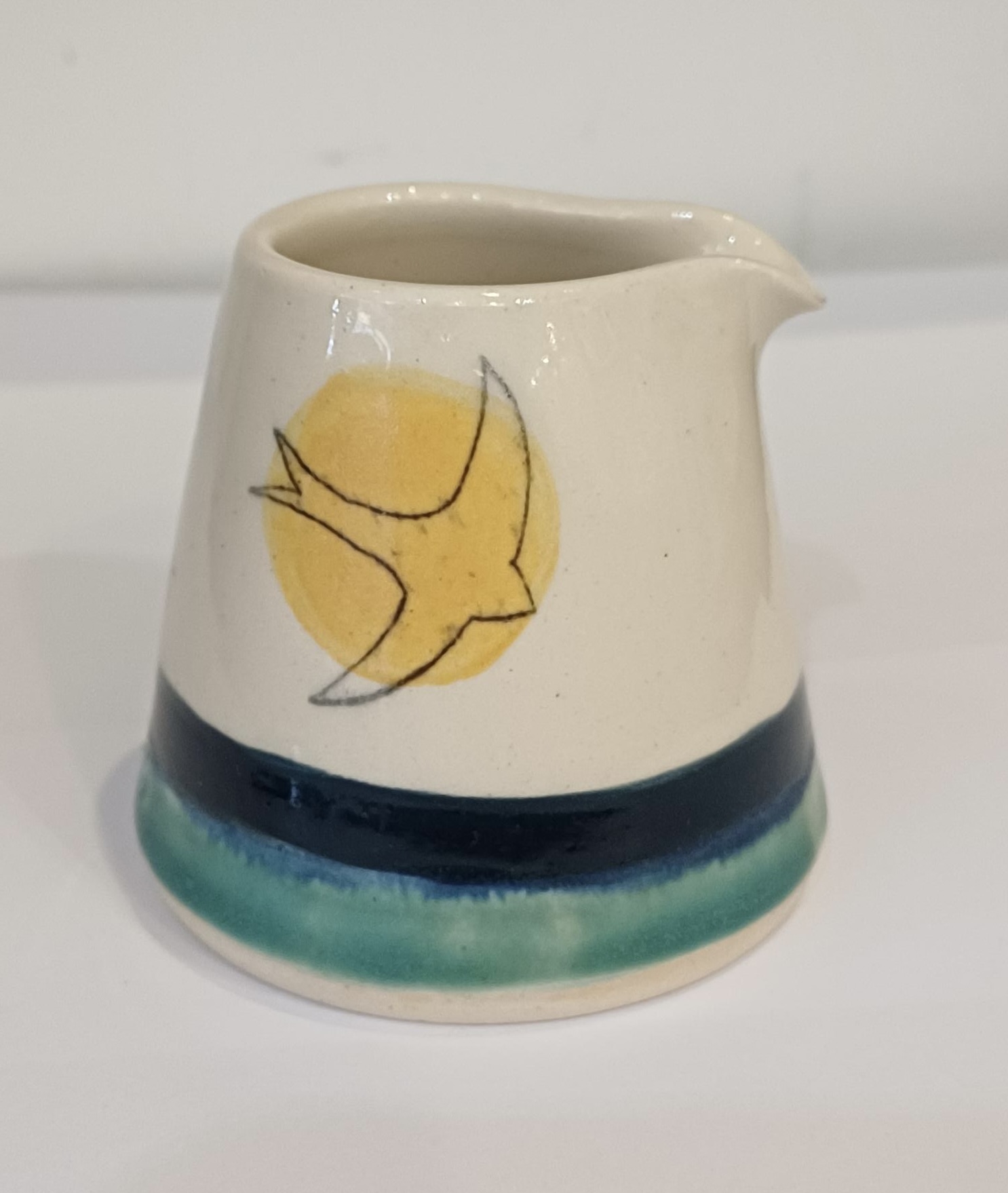 Handmade pourer, made from white stoneware clay and beautifully glazed in shades of turquoise, white, blue, green and golden with a delicate hand-drawn swift design. Dimensions are approximately 8cm in diameter at the base and 9.5cm tall. Ideal for milk or cream. Dimensions are approximately 6.5cm tall, 7cm in diameter at the base, and 5cm in diameter at the rim. Each item produced is unique and may vary in size and design, with the swift decoration facing left or right.