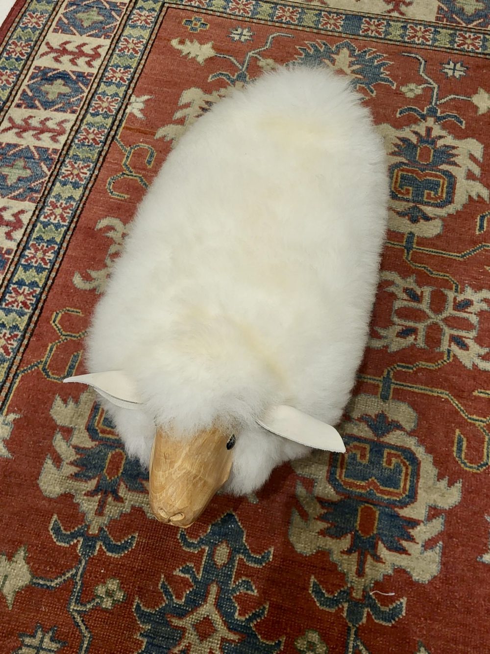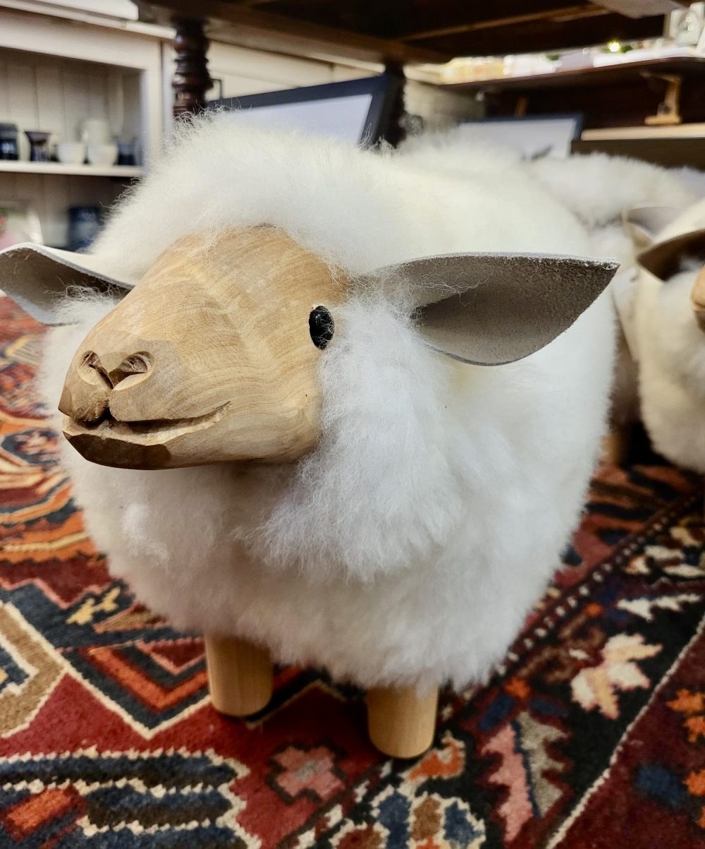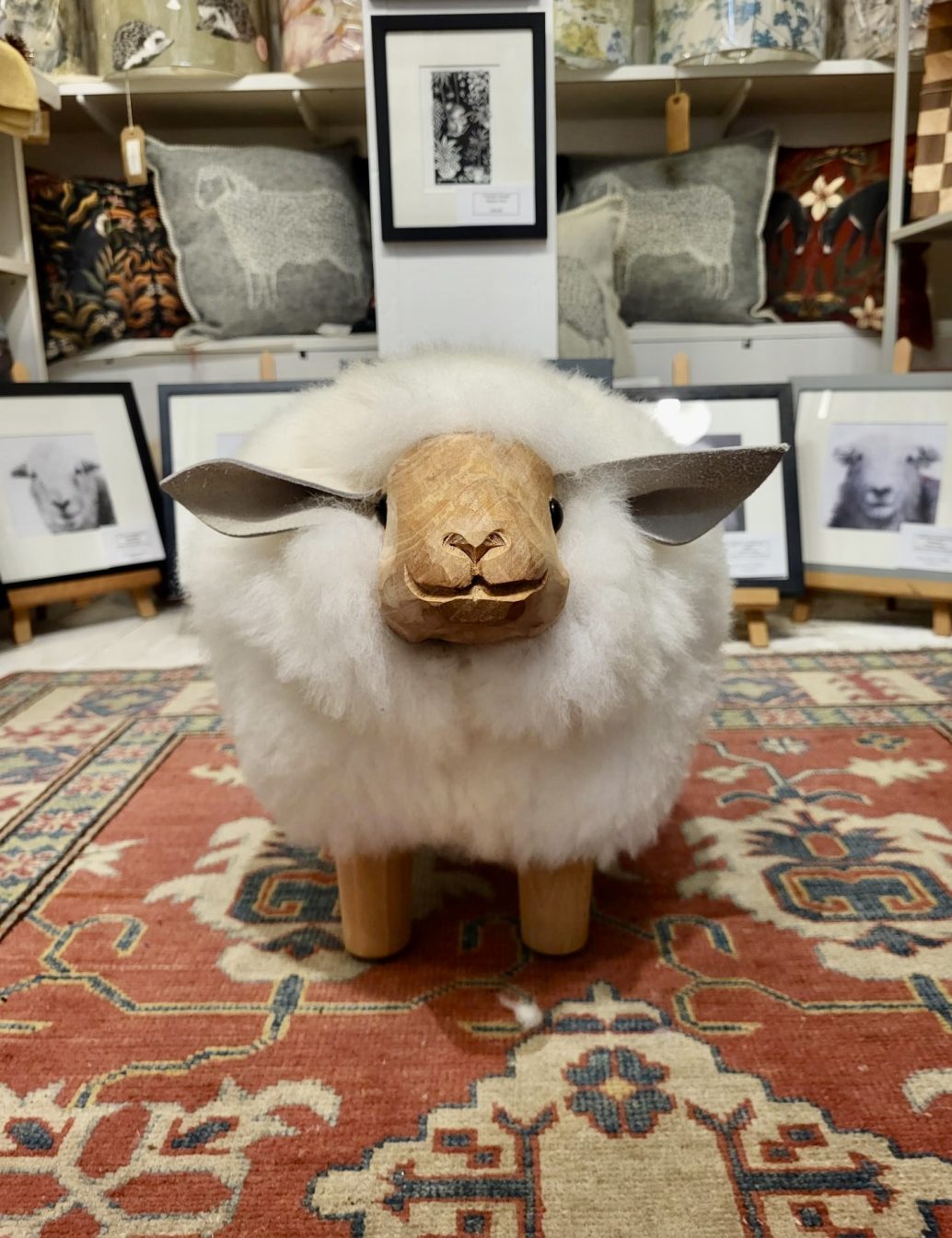 Beautiful sheep footstool. Holly’s face is hand-carved from English Lime wood in the UK, their ears are leather, and their body is expertly upholstered in a real off-white fleece, which is removable, should it need to be cleaned. A real favourite in the gallery, a high-quality item and a wonderful (and useful) addition to any home.