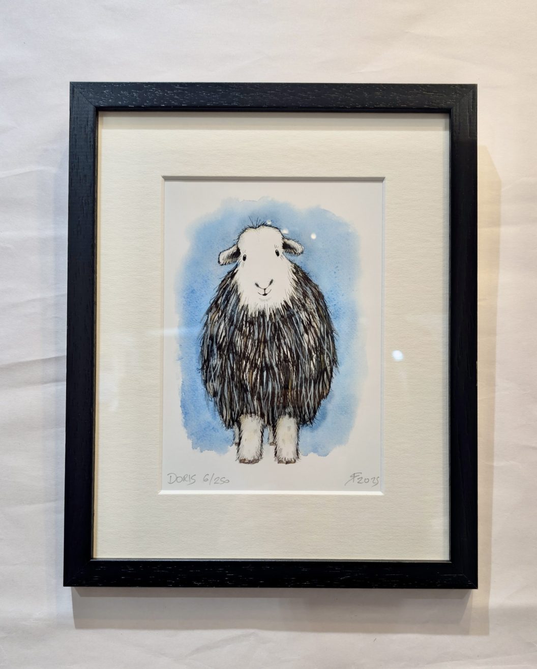 This lovely herdwick is a limited edition print in a series of illustrative watercolour & ink artwork. The artwork is framed and mounted in a painted black solid wood frame which has been hand cut and joined. Ready to hang with fixture. Exterior dimensions of the frame: approximately 22.3cm x 27.5cm, frame thickness approx 1.5cm.