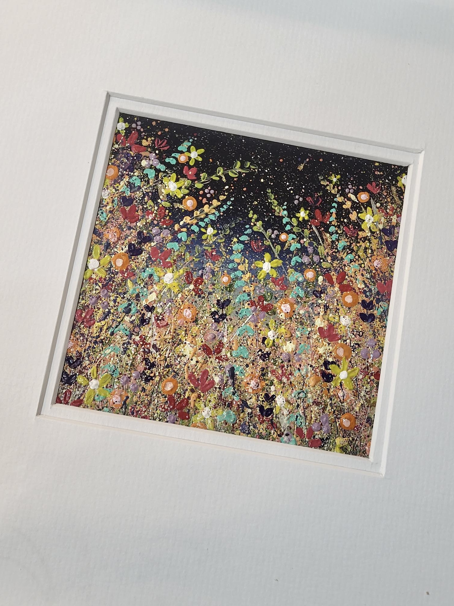 This square contemporary abstract painting has a vibrant seasonal palette and a midnight blue background. Painted with oil with gold leaf features that glisten in the light. This piece has been framed by the artist in a white frame that compliments the painting.