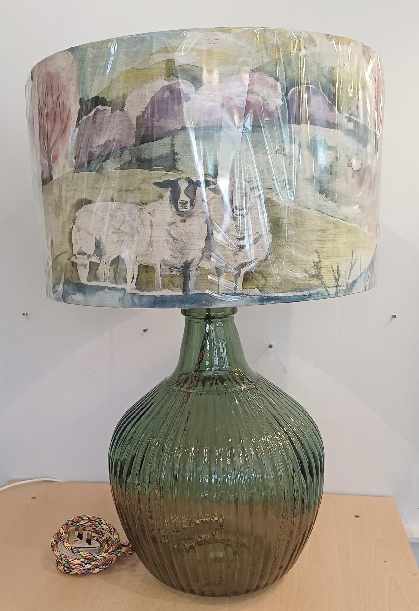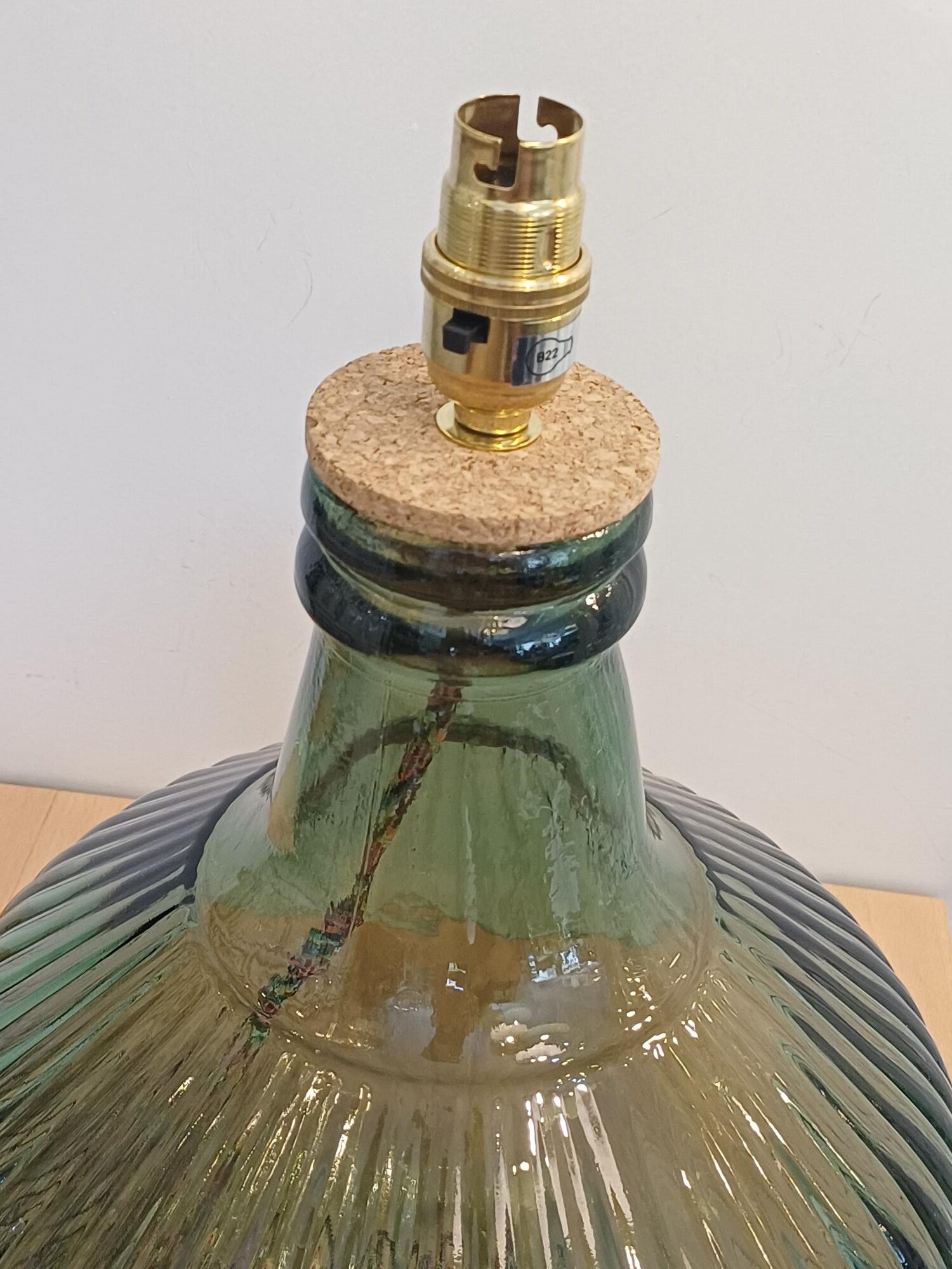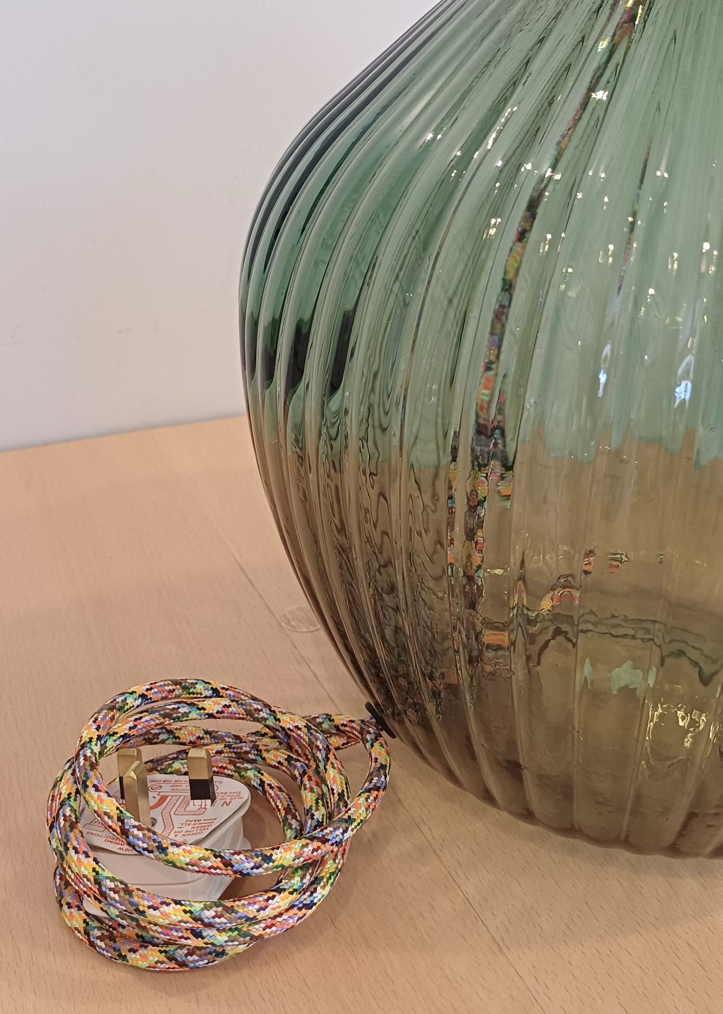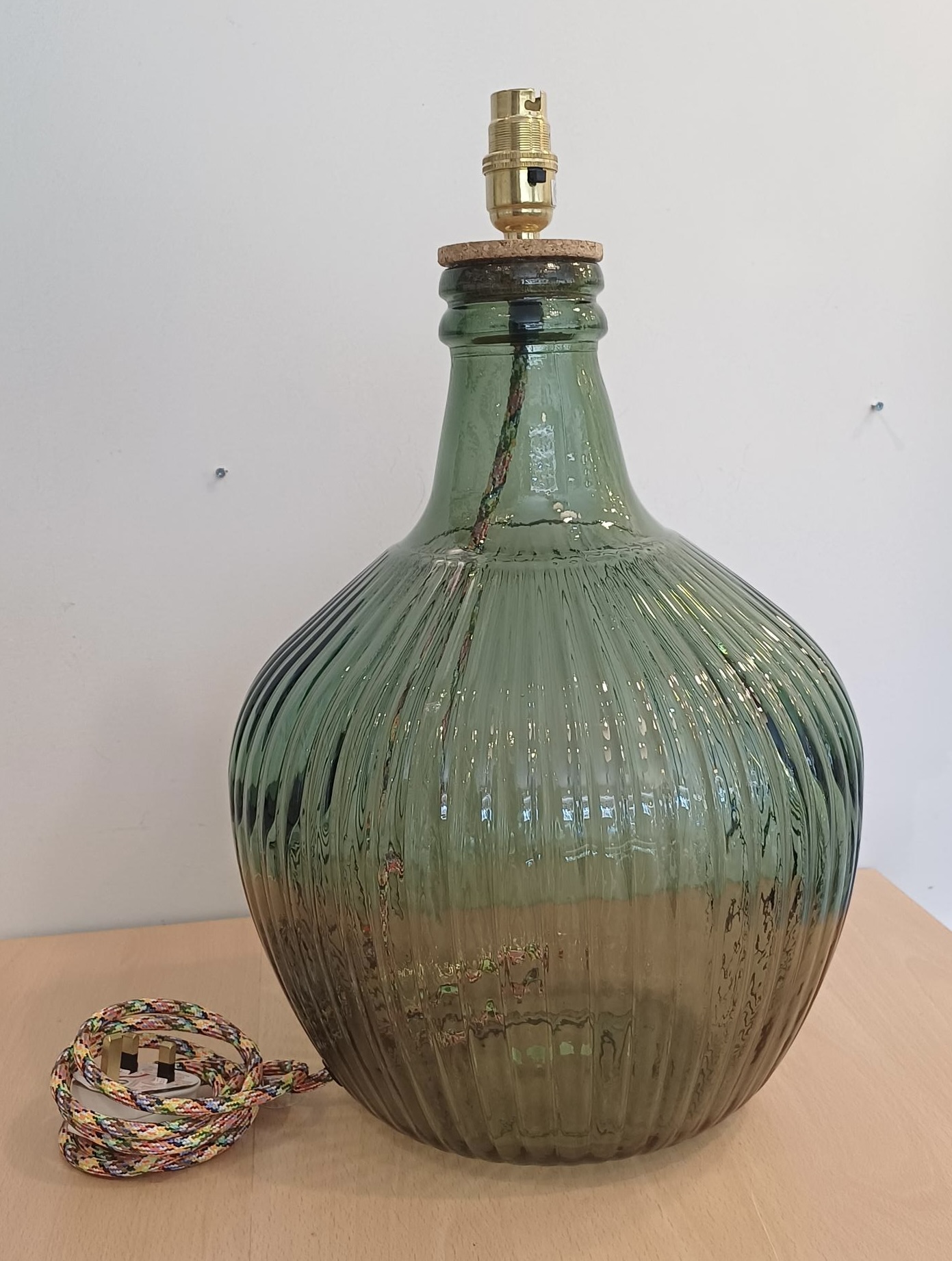 Attractive recycled round glass lamp, with a decorative ridged effect in green. A striking addition to any home. Dimensions without a shade are: height 44cm, width 29cm at its widest point. With a shade, the height is approximately 63cm.
