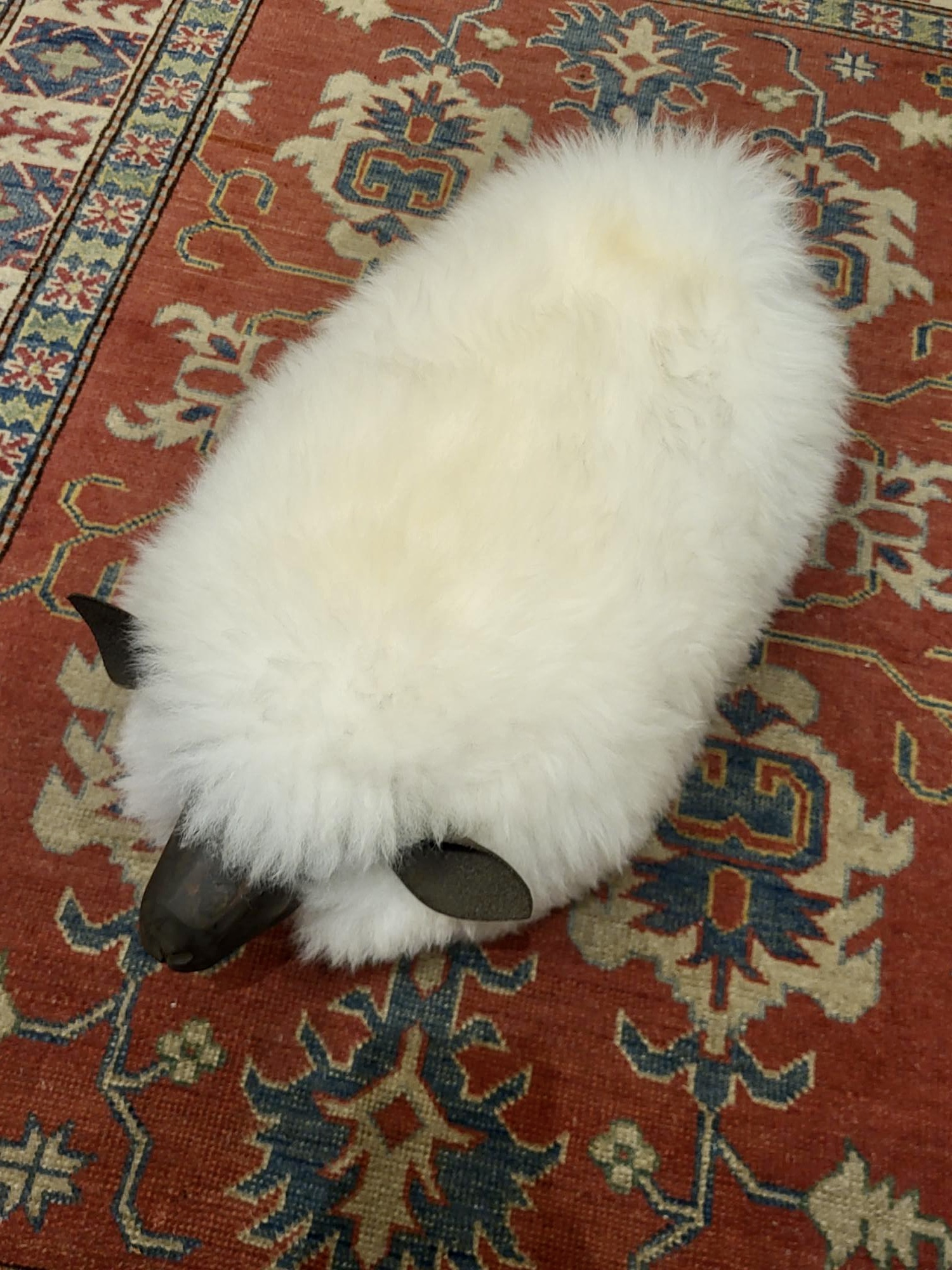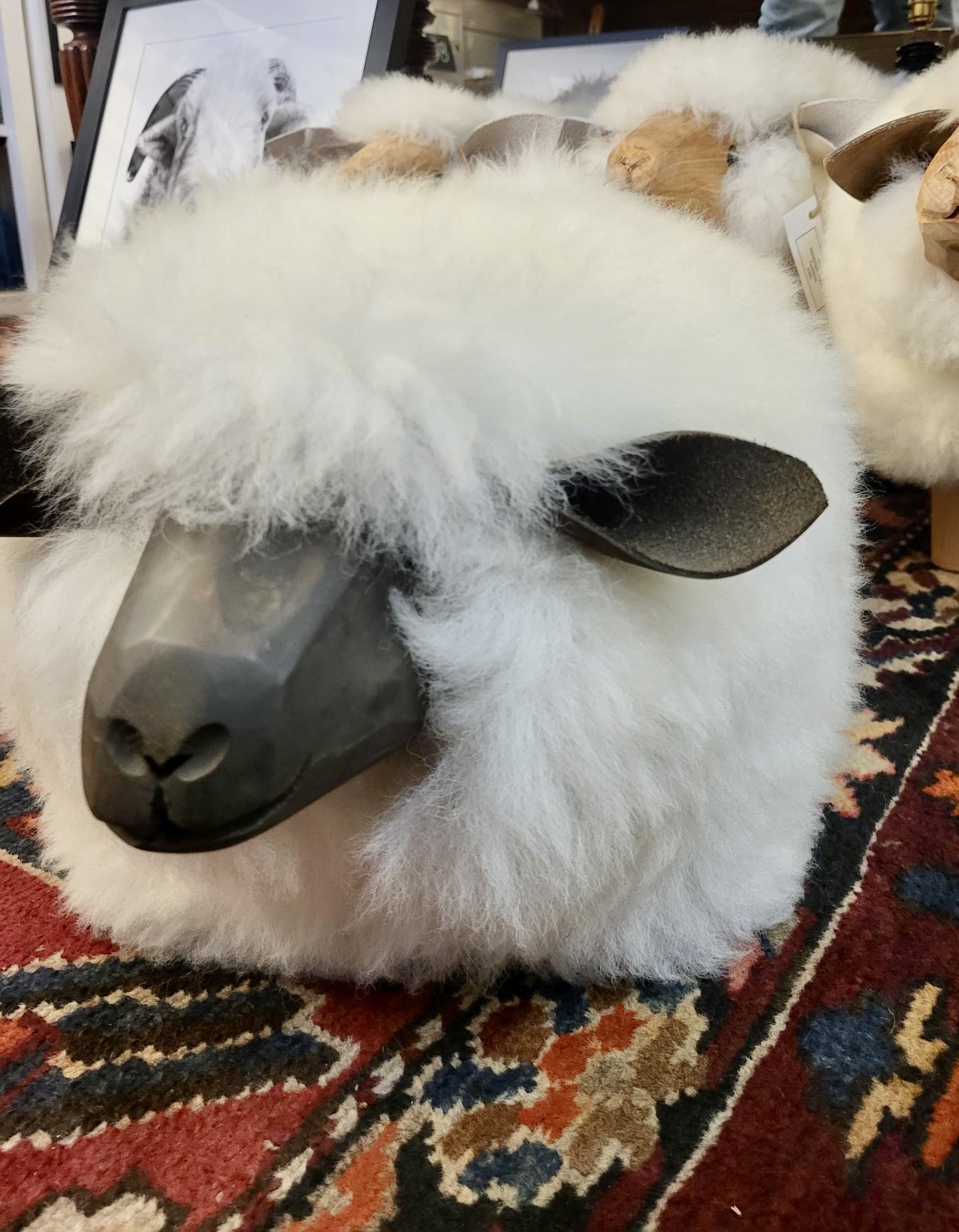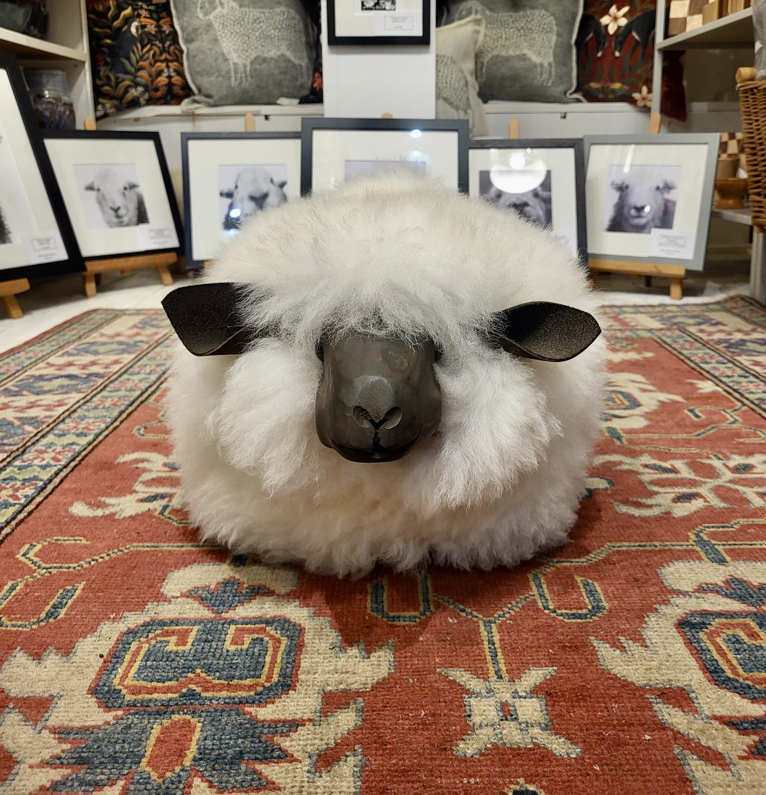 Beautiful sheep footstool. Sage’s face is hand-carved from English Lime wood in the UK, their ears are leather, and their body is expertly upholstered in a real off-white fleece, which is removable, should it need to be cleaned. A real favourite in the gallery, a high-quality item and a wonderful (and useful) addition to any home.