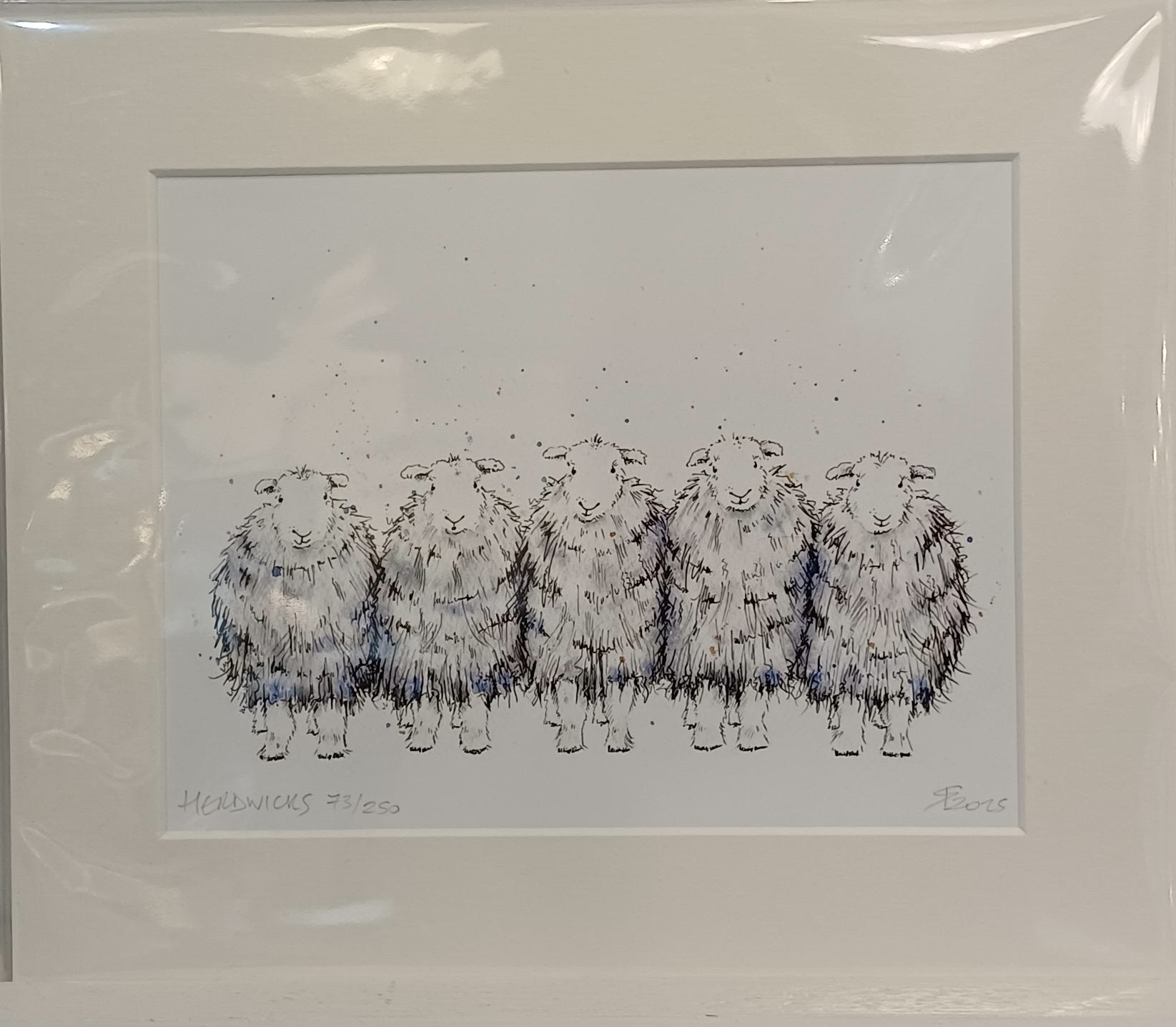 These happy little Herdwicks are a limited edition print of illustrative watercolour & ink artwork. Approximate size:  30.5cm x 25.5cm.